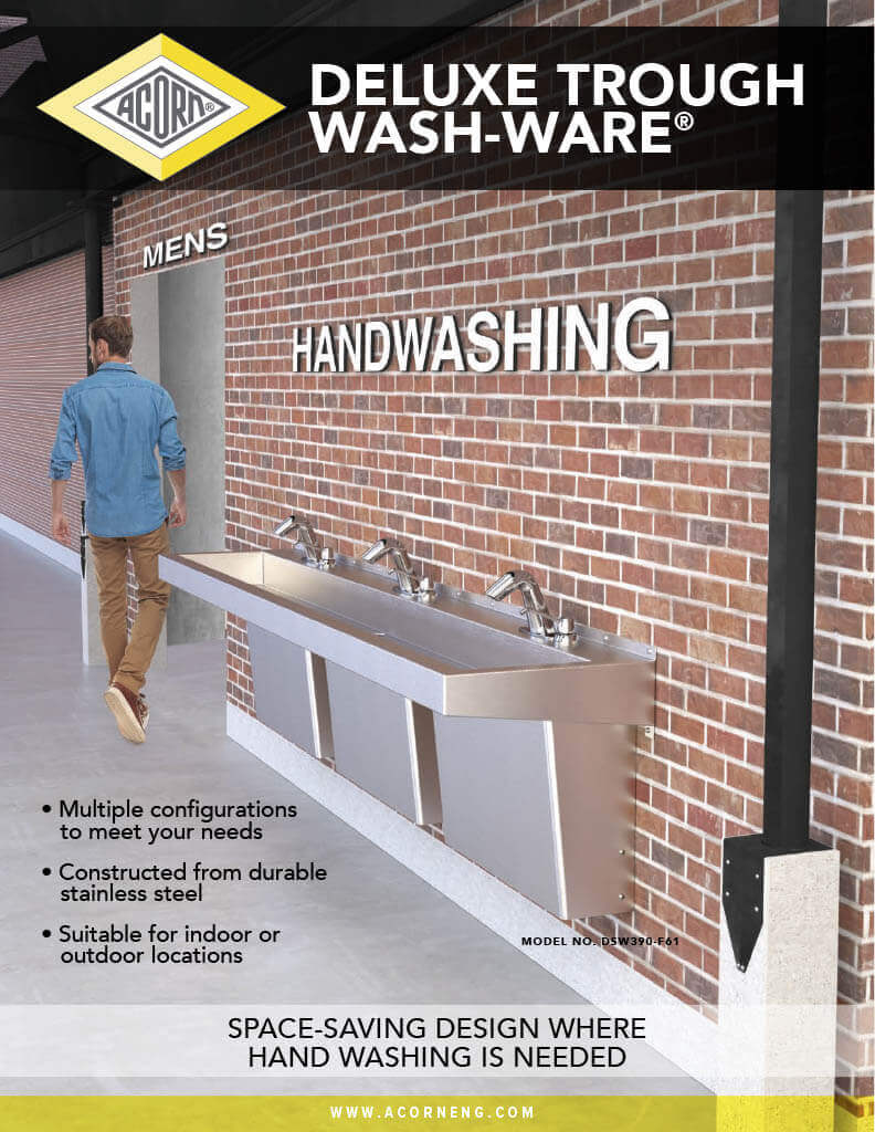 Acorn Engineering Company has introduced Deluxe Trough Wash-Ware®, a convenient, space-saving stainless steel trough sink that can be equipped with up to four hand washing stations. The compact design allows even small spaces to provide hand washing capabilities, and the units can be placed indoors or out, creating a consistent look.