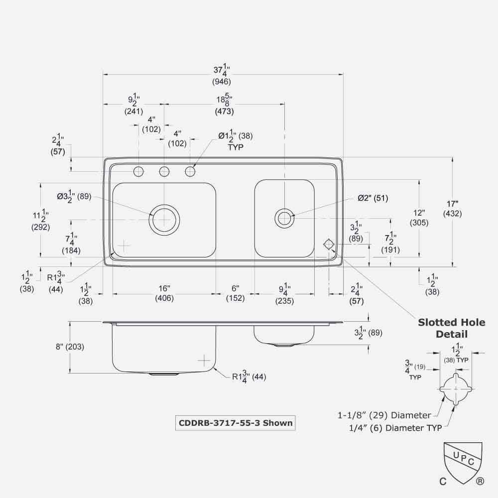 CDDRB-3717-55 features two bowls. The left bowl is for the faucet. It measures 16" (406 mm) side-to-side x 11-1/2" (292 mm) front-to-back x 8" (203 mm) deep with 1-3/4" (44 mm) radius corners. A 3-1/2" (89 mm) diameter drain is punched in the center of this bowl. Faucet punching is provided on the rear ledge of this bowl.