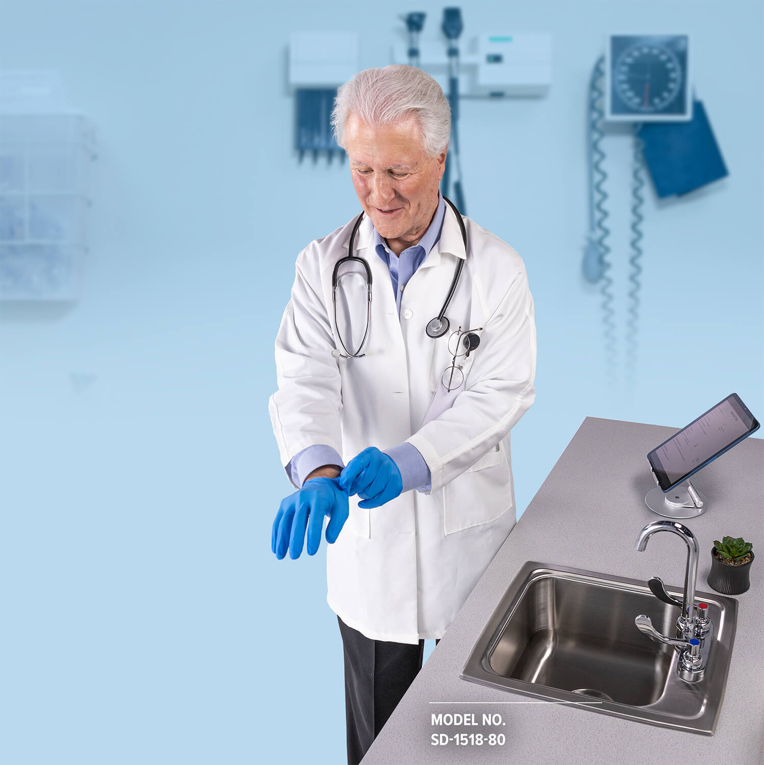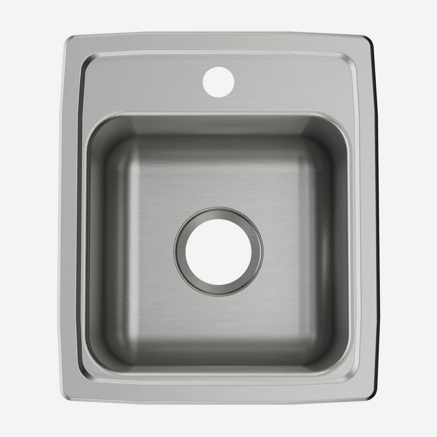 SD-1518 is a single bowl drop-in sink measuring 15" x 17-1/2" with a bowl size of 12" x 12". It has a centered drain and an 8" bowl depth. A minimum cabinet size of 18" is required.