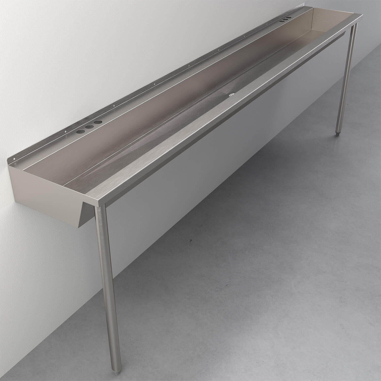 The trough sink is pre-drilled at each station with three punchings for a 4" (101.6 mm) centerset faucet. A pre-drilled backsplash return is provided for mounting unit to the wall. Basin is formed to facilitate drainage and is punched to accept a 1-1/2" drain assembly (sold separately). Unit is fabricated from 16-gauge, type 304 stainless steel with exposed surfaces polished to a #4 satin finish. Without the legs, this product is IAPMO compliant.