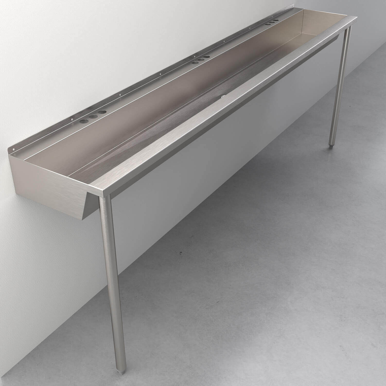 The trough sink is pre-drilled at each station with three punchings for a 4" (101.6 mm) centerset faucet. A pre-drilled backsplash return is provided for mounting unit to the wall. Basin is formed to facilitate drainage and is punched to accept a 1-1/2" drain assembly (sold separately). Unit is fabricated from 16-gauge, type 304 stainless steel with exposed surfaces polished to a #4 satin finish. Without the legs, this product is IAPMO compliant.