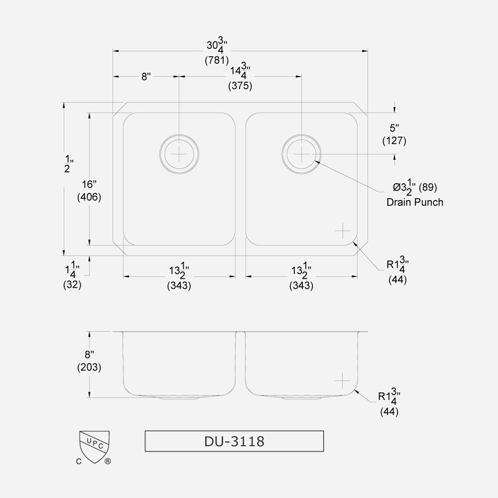 DU-3118-80 features a pair of 8" (203 mm) deep x 16" (406 mm) front-to-back x 13-1/2" (343 mm) wide bowl with 1-3/4" (44 mm) radius corners. A 3-1/2" (89 mm) diameter drain is punched 5" (127 mm) from the back wall of each bowl.
