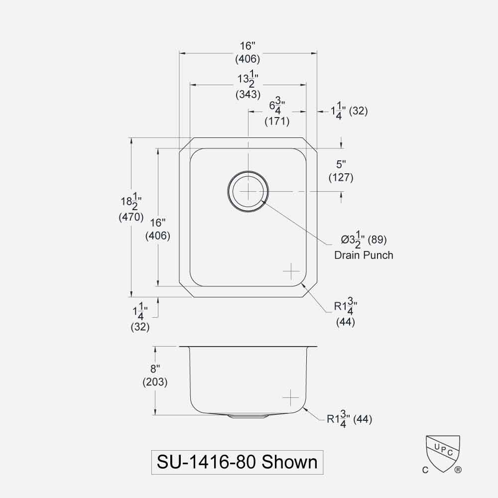 SU-1416-80 features an 8" (203 mm) deep x 16" (406 mm) front-to-back x 13-1/2" (343 mm) side-to-side bowl with 1-3/4" (44 mm) radius corners. A 3-1/2" (89 mm) diameter drain is punched 5" (127 mm) from the rear wall of the bowl. Overall dimensions are 16" (406 mm) side-to-side x 18-1/2" (470 mm) front-to-back.