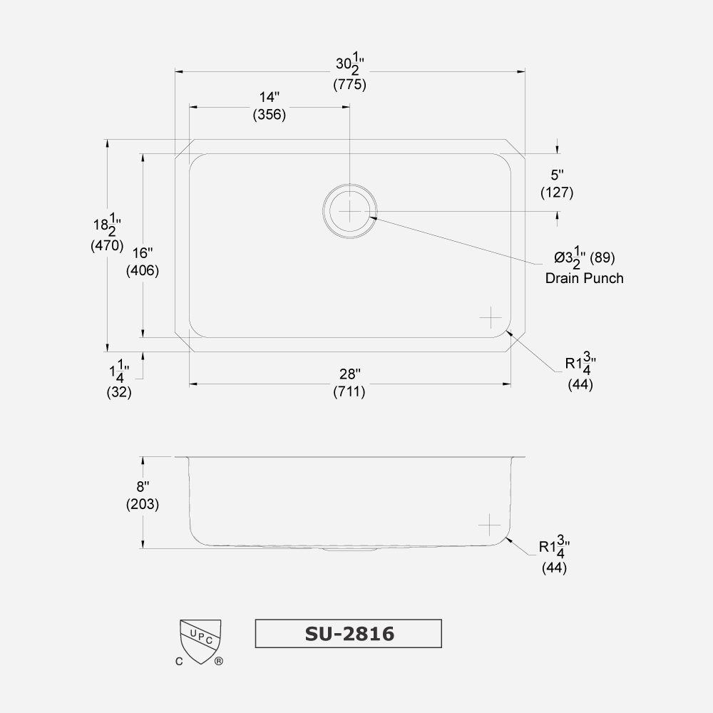 SU-2816 is a single bowl undermount sink measuring 30-1/2" x 18-1/2" with a bowl size of 28" x 16". It has a center back drain and an 8" bowl depth. A minimum cabinet size of 36" is required.
