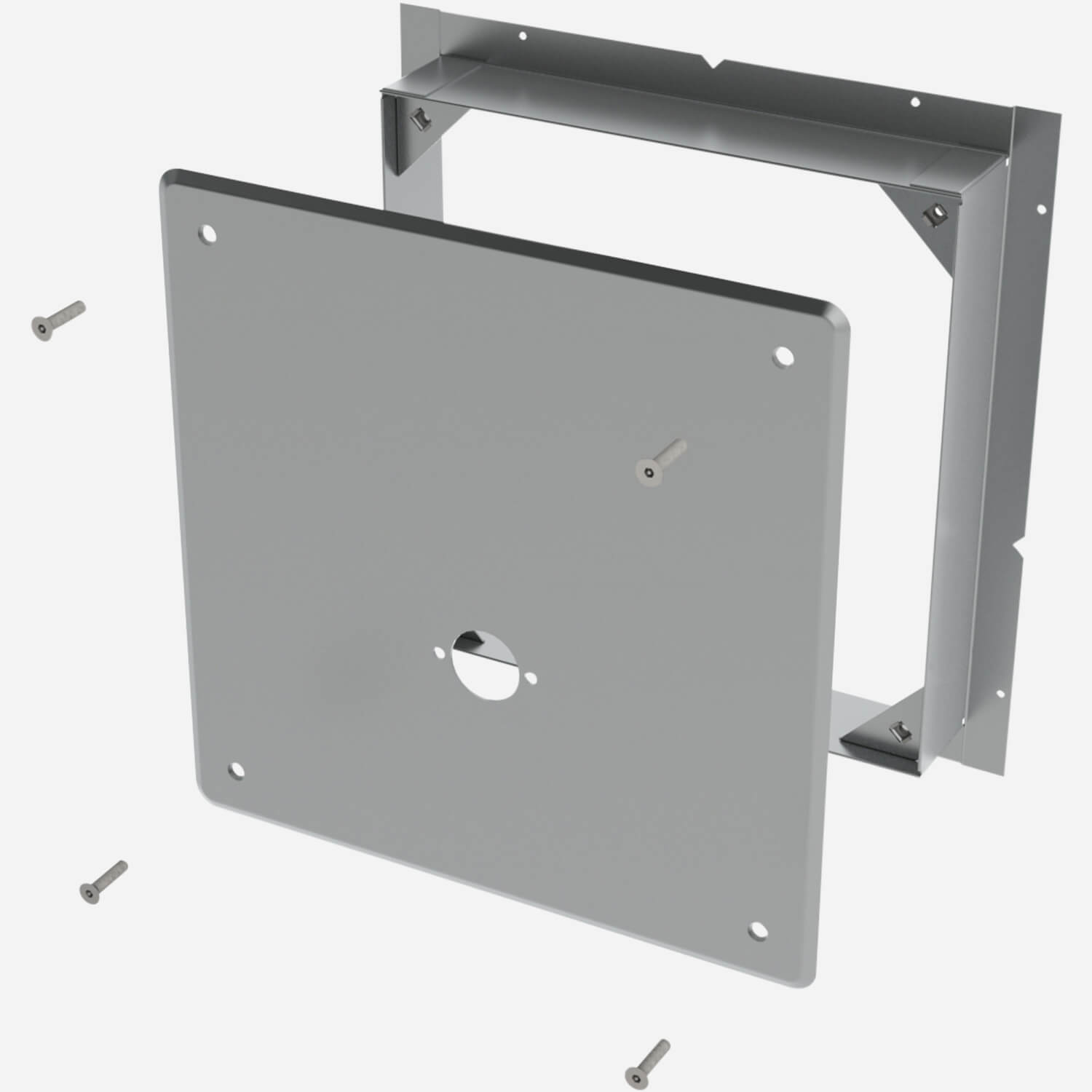 The Flush Valve Access Panel design provides access to a concealed flush valve when no access is provided behind the wall. The mounting frame is fabricated of 20 gauge galvanized steel for walls 2” (50mm) minimum to 12” (305mm) maximum thick. A 14" 356 mm) square removable access panel cover is fabricated of 14 gauge type 304 stainless steel with a satin finish. 1-1/2" diameter hole is provided for a pushbutton assembly.