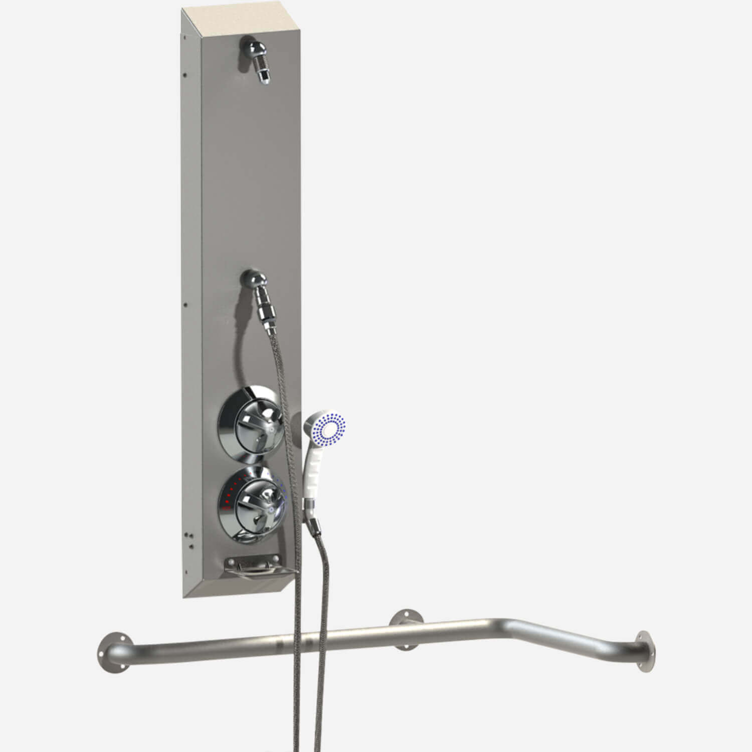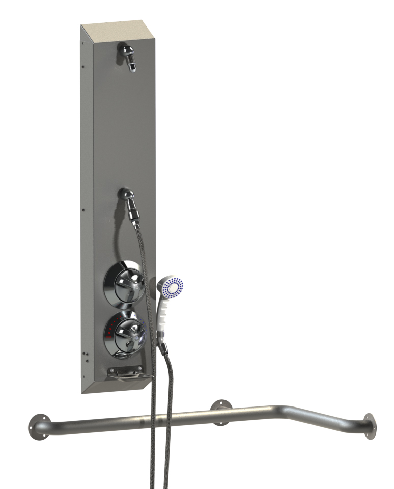 The shower housing shall be fabricated from 18 gauge, type 304 stainless steel, and shall have a satin finish with 30-degree sloping top and bottom. The exposed trim shall be chrome-plated brass. Fixture shall be furnished with an ADA compliant control valve with a Ligature Resistant ADA Compliant Tri-Lever Handle, lever handle or pushbutton, fixed shower head, a quick disconnect hand shower with on/off pushbutton, vacuum breaker and flow control, a diverter valve with a Ligature Resistant ADA Compliant Tri-Lever handle or a lever handle, a two-wall stainless steel grab bar, and a padded vinyl folding seat. Units to conform with most ANSI, UFAS, and ADA requirements for accessibility.