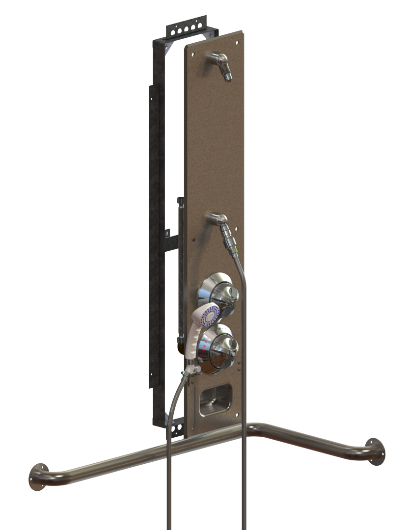 The shower panel shall be fabricated from 18 gauge, type 304 stainless steel, and shall have a satin finish. The exposed trim shall be chrome-plated brass. Fixture shall be furnished with an ADA compliant control valve with a Ligature Resistant ADA Compliant Tri-Lever Handle, lever handle or pushbutton, fixed shower head, a quick disconnect hand shower with on/off pushbutton, vacuum breaker and flow control, a diverter valve with an ADA Compliant Tri-Lever Handle or lever handle, recessed soap dish, a two-wall stainless steel grab bar, and a padded vinyl folding seat. Units to conform with ANSI, UFAS, and ADA requirements for accessibility.