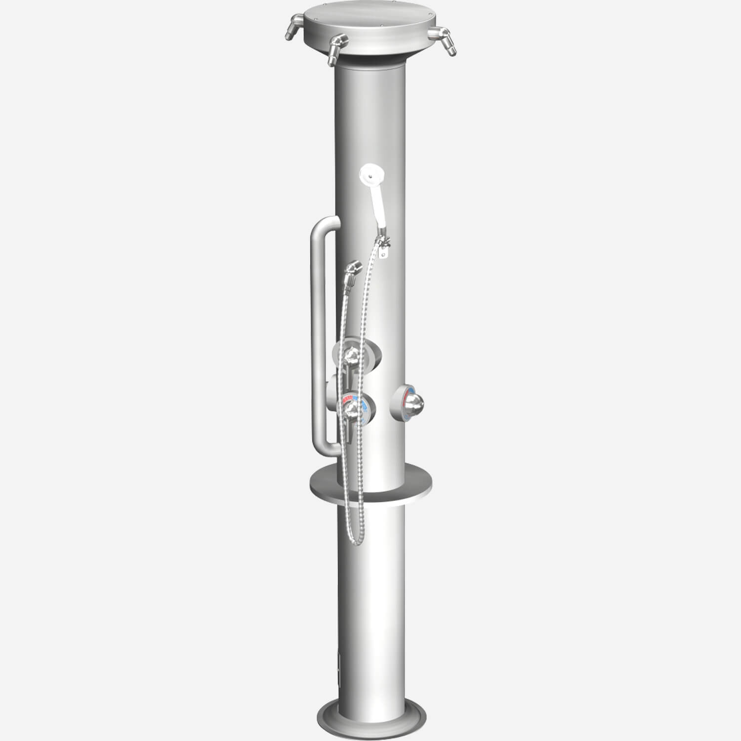 Column shall be 16 gauge, type 304 stainless steel with satin finish. Column shall be factory pre-piped and hydrostatically tested to 150 PSI. Drain base shall be heavy cast iron with a rust preventative coating. Provide handicap station complete with diverter valve, fixed upper head, handshower and vertical grab bar. Though the shower fixture is handicap accessible, the product is NOT ADA compliant.