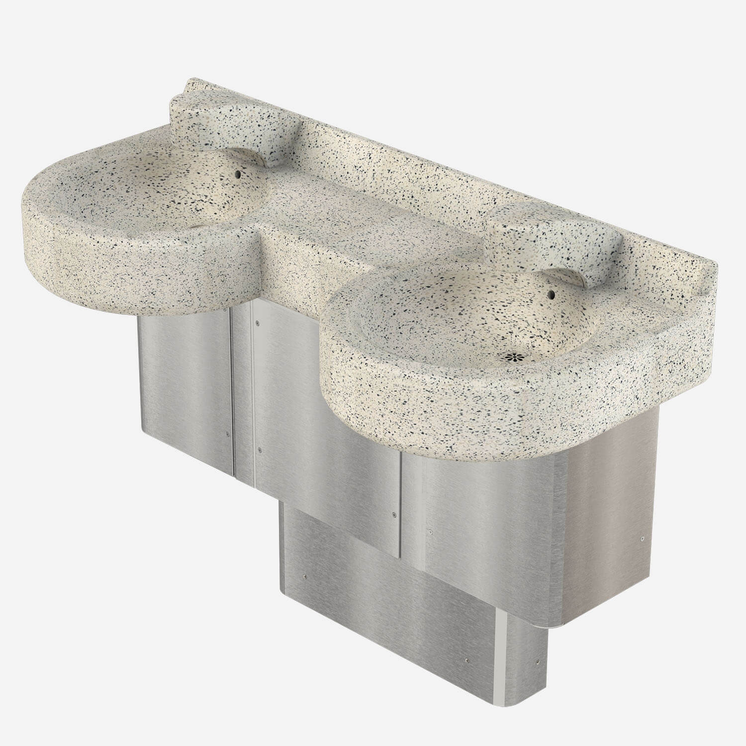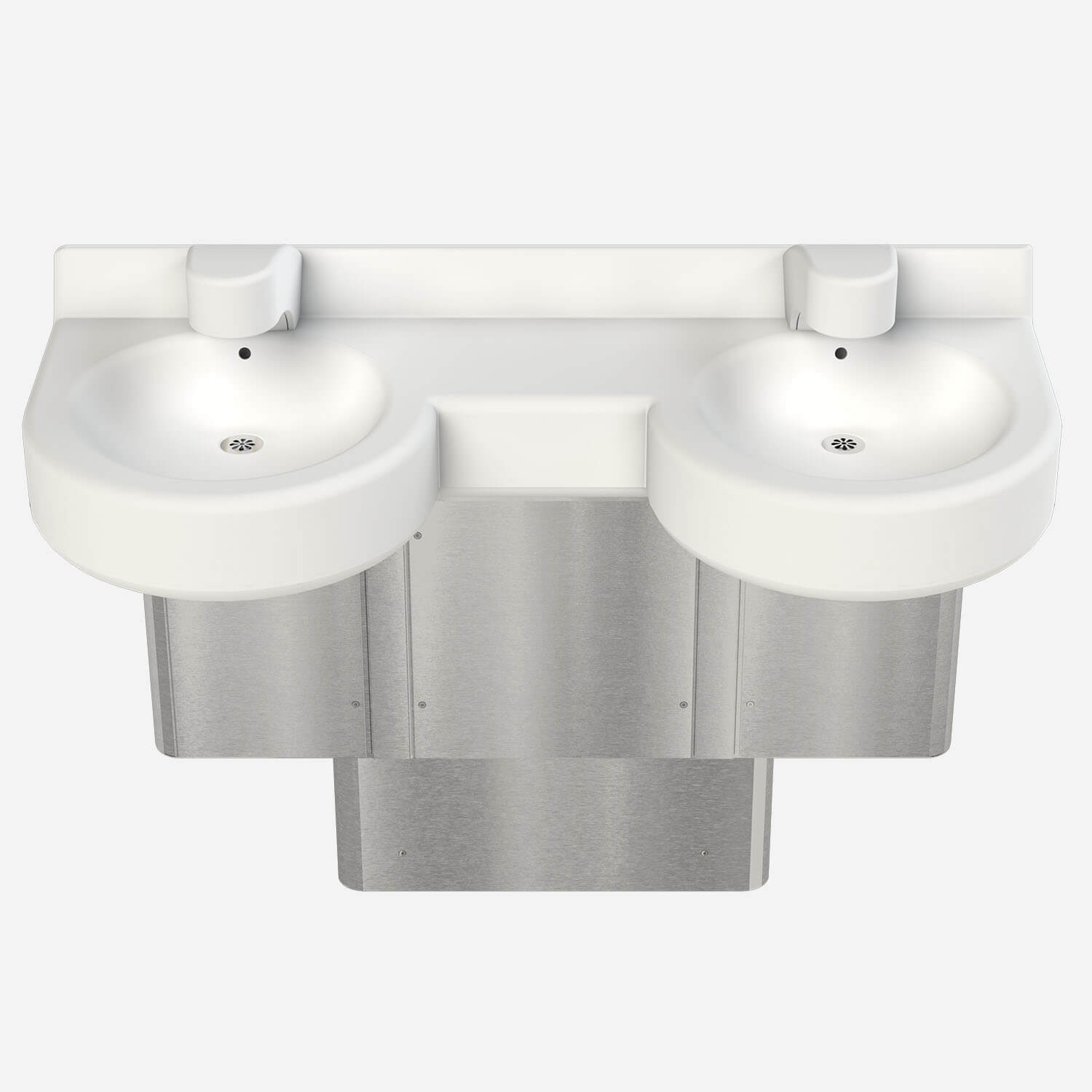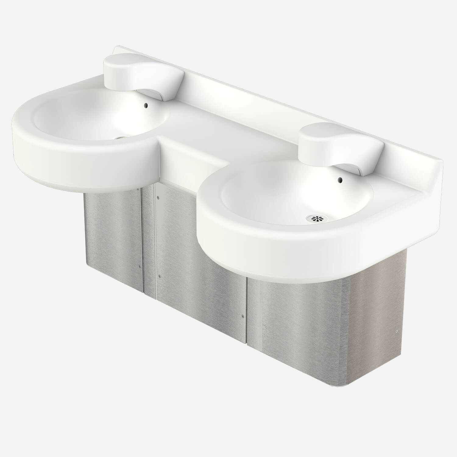 Perfect for high-traffic institutional, commercial and public applications, this curve-front two-station hand wash basin is made from Corterra ® solid surface, which also offers design flexibility and durability. It features a wall mount, off-floor or on-floor waste outlet configurations, and is ADA compliant when installed properly.