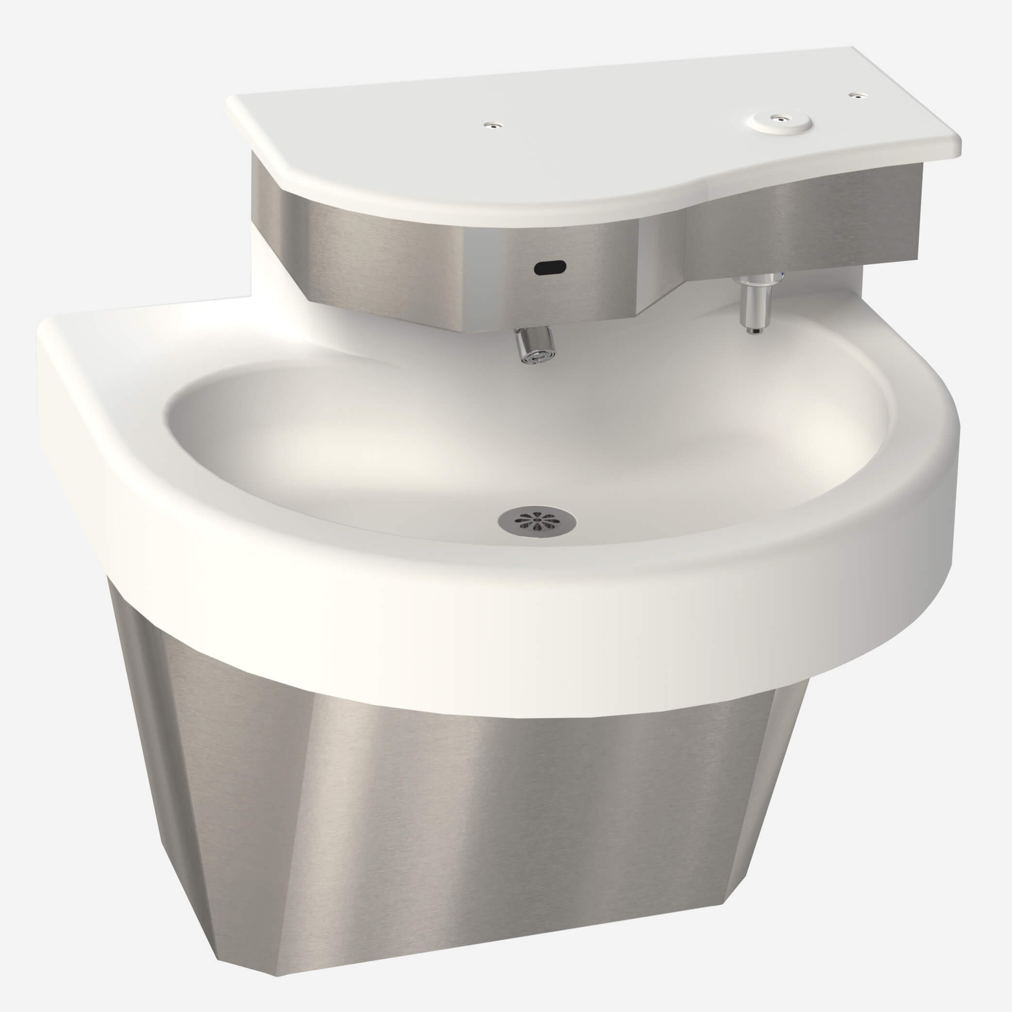 Constructed with long-lasting, impact and stain-resistant Corterra® solid surface material, Meridian® Kurve® washbasins are ideal for institutional and public installations. This one-station wash basin features a wall mount, off-floor with wall waste outlet configuration, a curve front design, and is ADA compliant when installed properly. Left and Right Orientations are available to meet design needs.