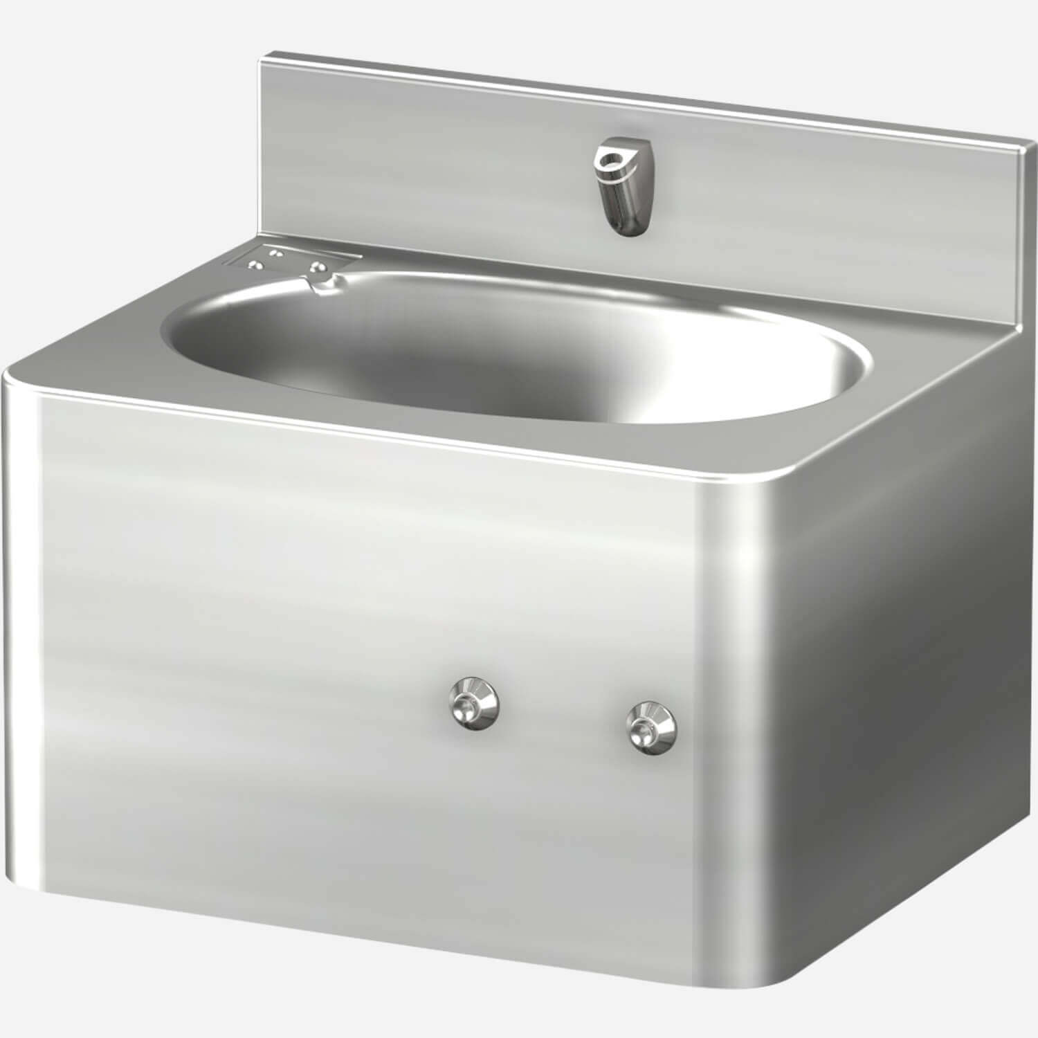This 18 inch, vandal-resistant, stainless steel security lavatory features an oval bowl, self-draining soap dish, and is designed for a wall mount application. It mounts off-floor and has a wall waste outlet. The fixture is configured with front access for installation and maintenance, where a typical security servicing chase is not available.