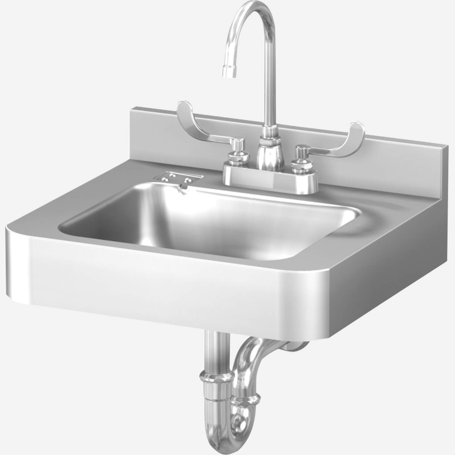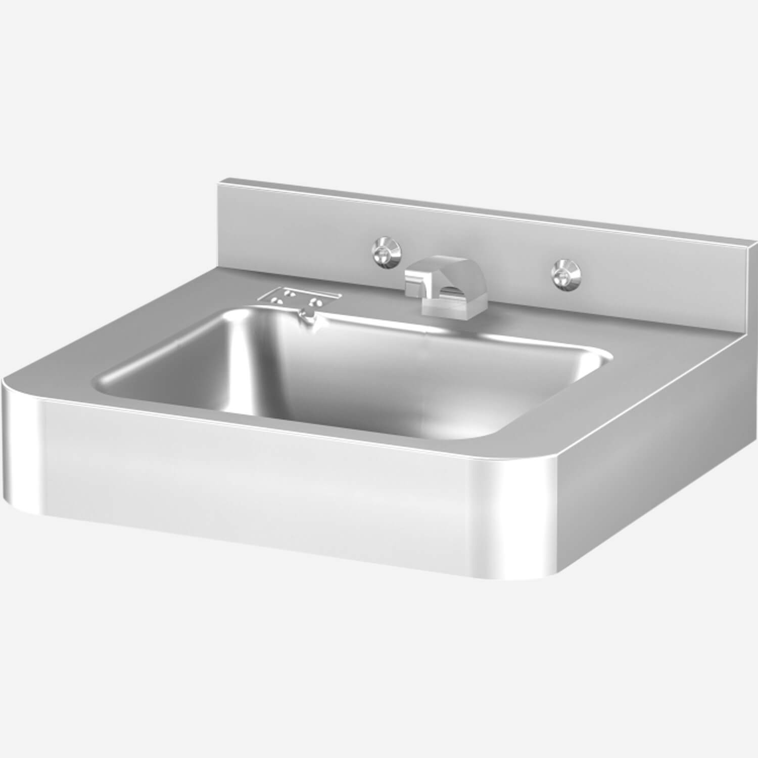 This 18" x 18" vandal resistant, stainless steel lavatory features a rectangular bowl, self-draining soap dish, and is designed for a wall mount application. It mounts off-floor and has a wall waste outlet.