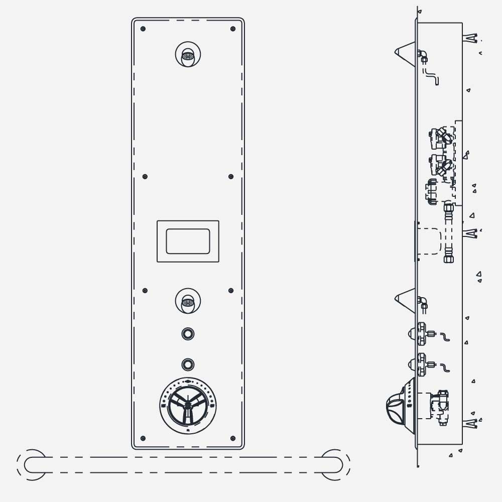 The shower also features two riser metering valves controlling the upper and lower shower heads the specific valve must be specified with one of the following type of valve. The riser valves will be provided on a manifold assembly - in this case with two valves (-MA2)