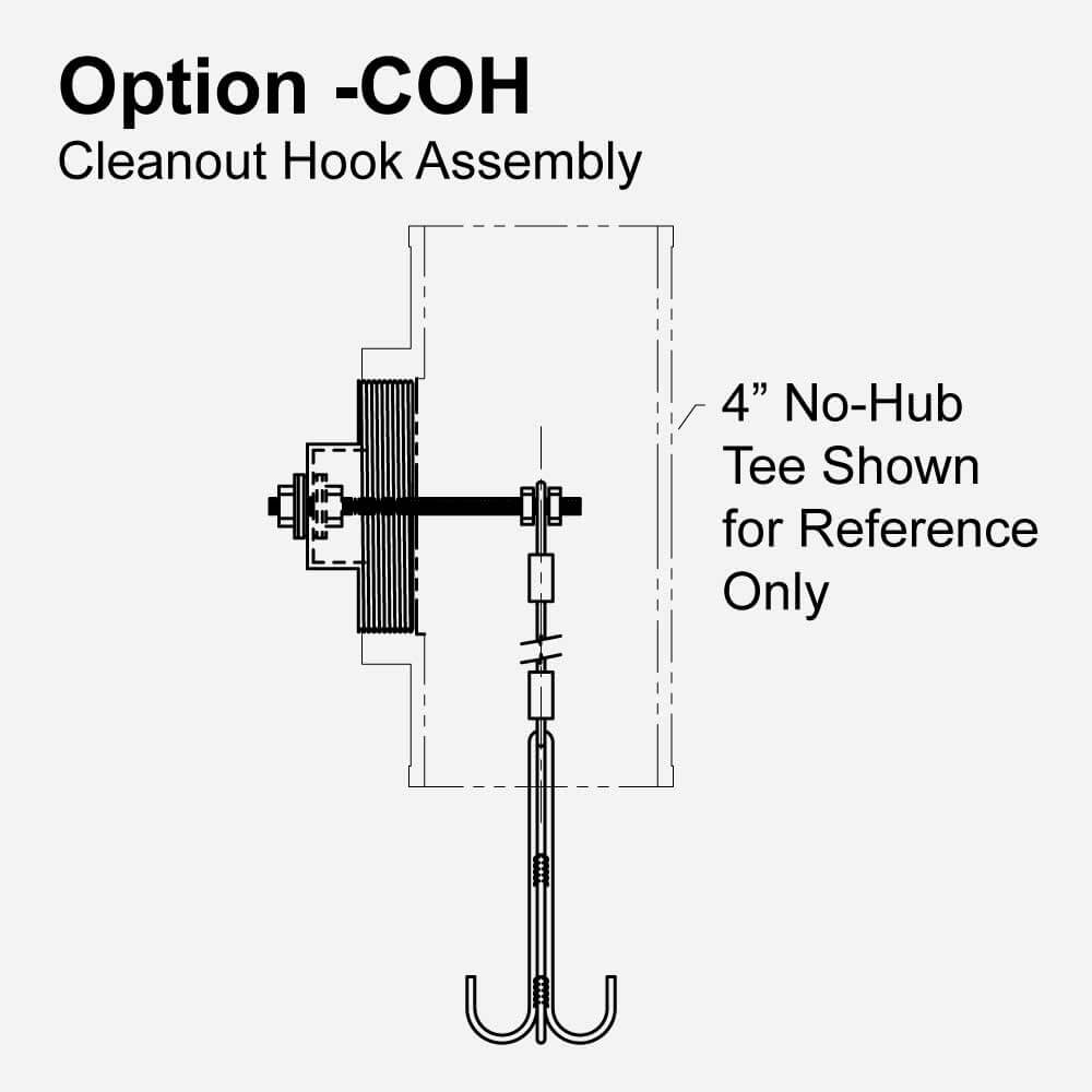 Please note assemby does not include tee. This option provides a 6" stainless steel four prong hook in the cleanout. Hook is connected to 31" steel wire rope and is connected to a 4" brass plug with a 4-1/2" bolt. Plug to bolt connection is water tight.