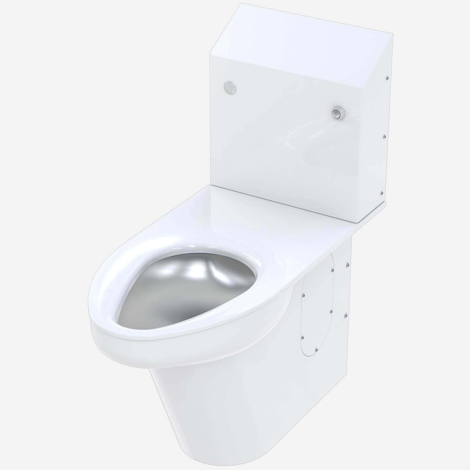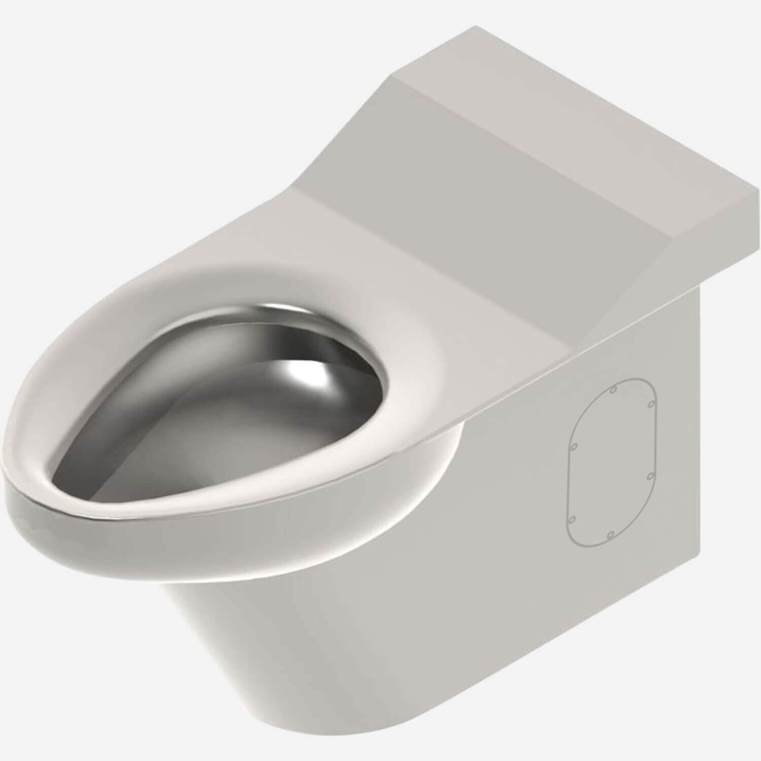 Ligature Resistant Toilet contoured ligature-resistant housing is fabricated from 16 gauge type 304 stainless steel and polished to a satin finish. The inside of the toilet bowl also has a satin finish. Engineered to reduce possible risk of the fixture being used as a ligature device. Mounting is intended for rear installations. Housing includes access panel on each side for installation of fixture.